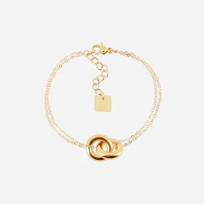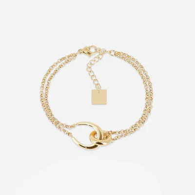 Bracelet en acier uni ou doré au bout duquel 2 anneaux sont accrochés l’un à l’autre.
