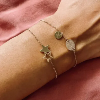 Bracelet chaînette en acier uni ou doré à l’or fin par ionisation sur lequel sont attachés deux étoiles, l’une creusée et l’autre remplie.