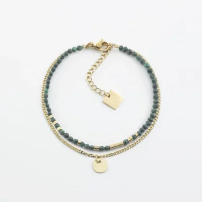 Bracelet double rang en acier doré à l’or fin par ionisation. Le premier rang est un enfilage de pierres naturelles mélangé à des ajouts de métal, et le deuxième est une petite chaîne gourmette classique.
