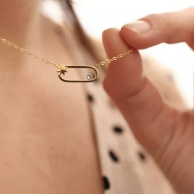 Collier chaîne en acier doré à l’or fin par ionisation. Deux ornements sont attachées à la chaîne, l’un est un motif d’Étoile du Nord sertie de zirconium et l’autre, une petite boule doré.