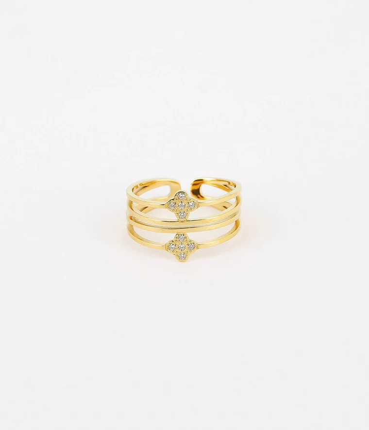 Bague ajustable en acier uni ou doré à l’or fin par ionisation formée de plusieurs anneaux réunis ensemble par deux motifs de zirconiums sertis.
