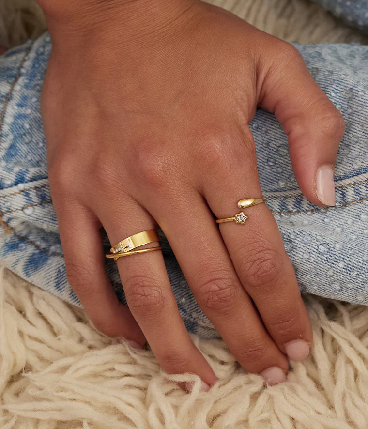 Bague fine en acier uni ou doré à l’or fin. Cette bague est ouverte sur le devant et est sertie d’une étoile en zirconium.