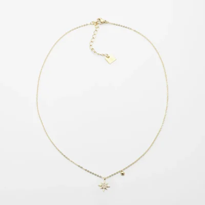 39,00€Collier chaîne en acier doré à l’or fin par ionisation. Deux ornements sont attachées à la chaîne, l’un est un motif d’Étoile du Nord sertie de zirconium et l’autre, une petite boule doré.