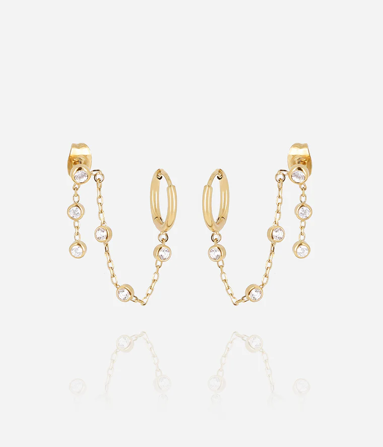 Boucles d’oreilles double en acier uni ou doré à l’or fin par ionisation. Le premier piercing puce est serti d’un zirconium, l’autre est une petite créole, les deux sont reliés par une chainette sertie de zirconiums.