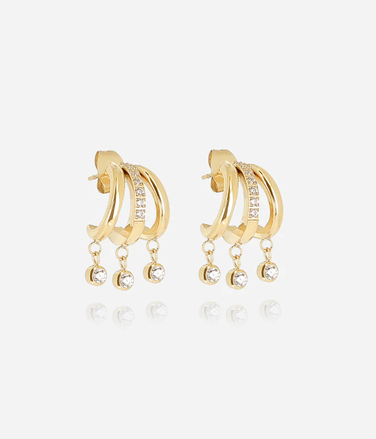 Boucles d’oreilles multi créoles en acier uni ou doré à l’or fin par ionisation composées de 5 anneaux alignés créant un effet d’accumulation. L’un des anneaux est sertis de zirconiums.