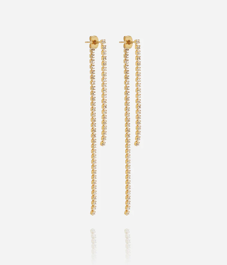Boucles d’oreilles en acier uni ou doré à l’or fin par ionisation serties de 2 rangées de zirconiums. L’une se place derrière le lobe et l’autre devant, ce qui donne un effet de relief.