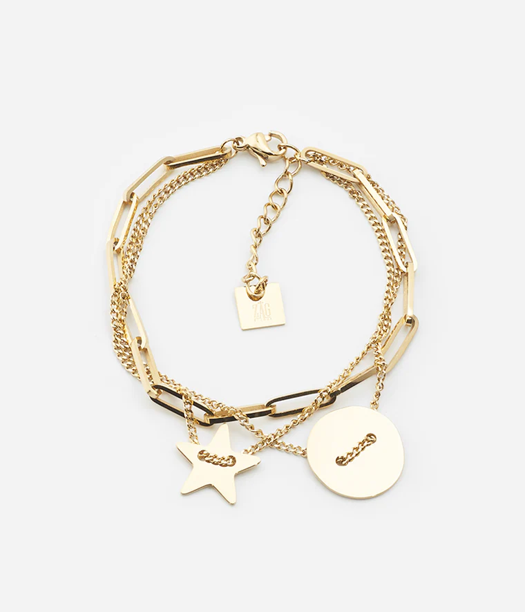 Bracelet triple chaîne en acier uni ou doré à l’or fin par ionisation sur laquelle sont accrochées une étoile et une pastille de métal.