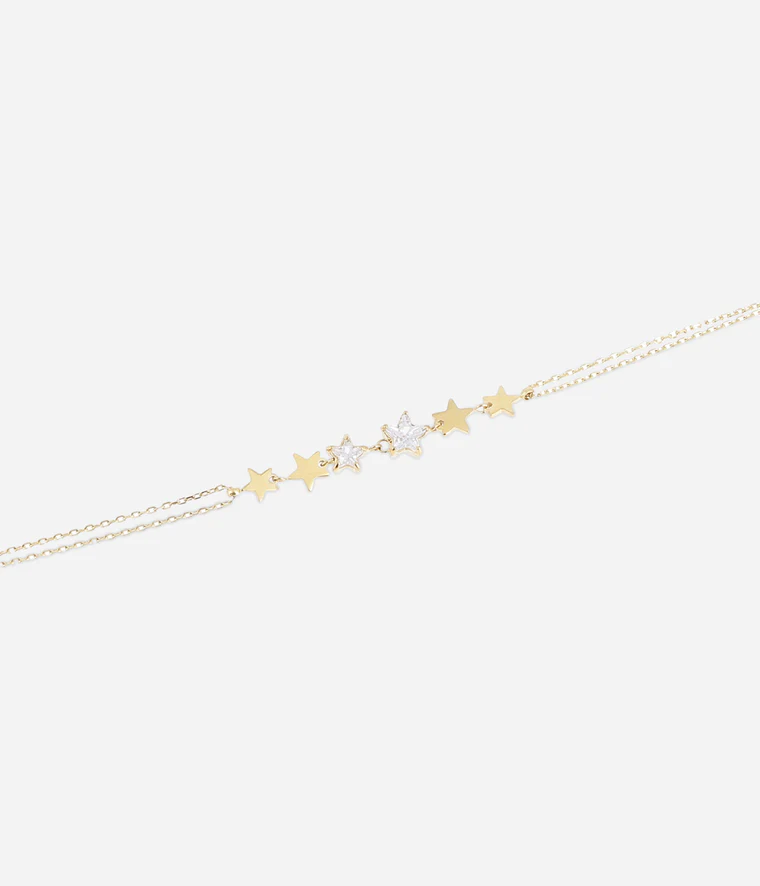 Bracelet en acier uni ou doré à l’or fin par ionisation composé de plusieurs étoiles reliées les unes au dessus des autres grâce à des petits maillons. 2 étoiles sont en zirconium.