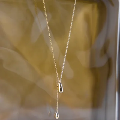 35,00€Collier en acier doré à l’or fin par ionisation serti de 2 pendentifs en forme de goutte, l’un est relié à une chainette donnant un effet de cascade.