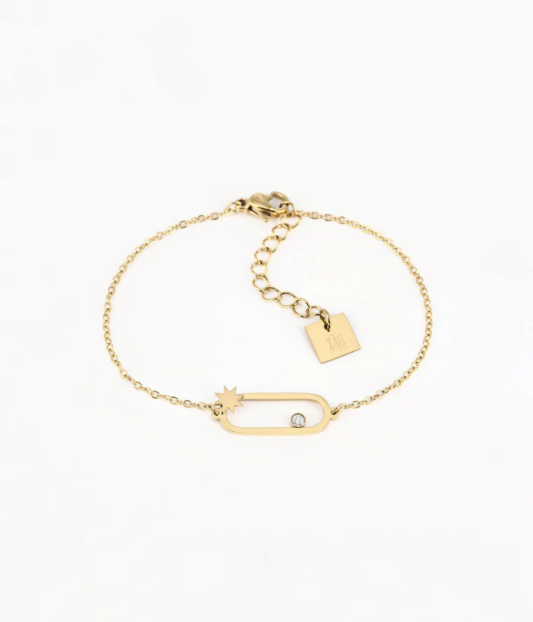 Bracelet en acier uni ou doré à l’or fin par ionisation. Un ovale de métal laqué d’un cristal en serti clos est placé entre les deux chaînes.