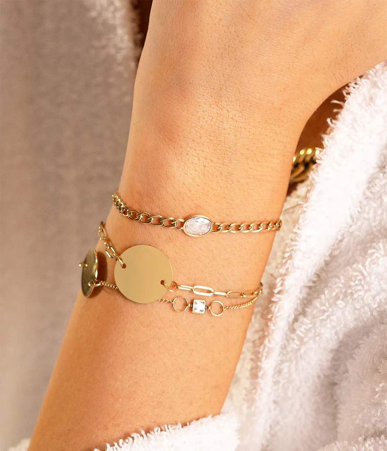 Bracelet en maille en acier doré à l’or fin par ionisation serti d’un zirconium coloré ovale.