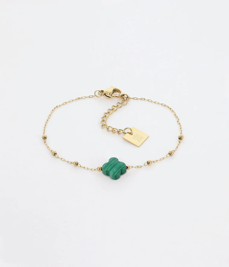 Bracelet chaîne « chapelet » en acier uni ou doré à l’or fin par ionisation, sur lequel est attachée une pierre naturelle facettée en forme de trèfle.