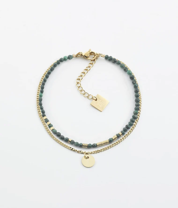 Bracelet double rang en acier doré à l’or fin par ionisation. Le premier rang est un enfilage de pierres naturelles mélangé à des ajouts de métal, et le deuxième est une petite chaîne gourmette classique.