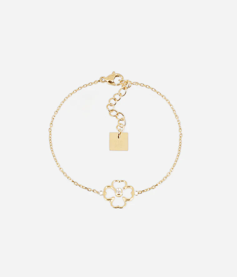 Bracelet en acier uni ou doré à l’or fin serti d’une fleur en acier au milieu de laquelle se trouve un zirconium.