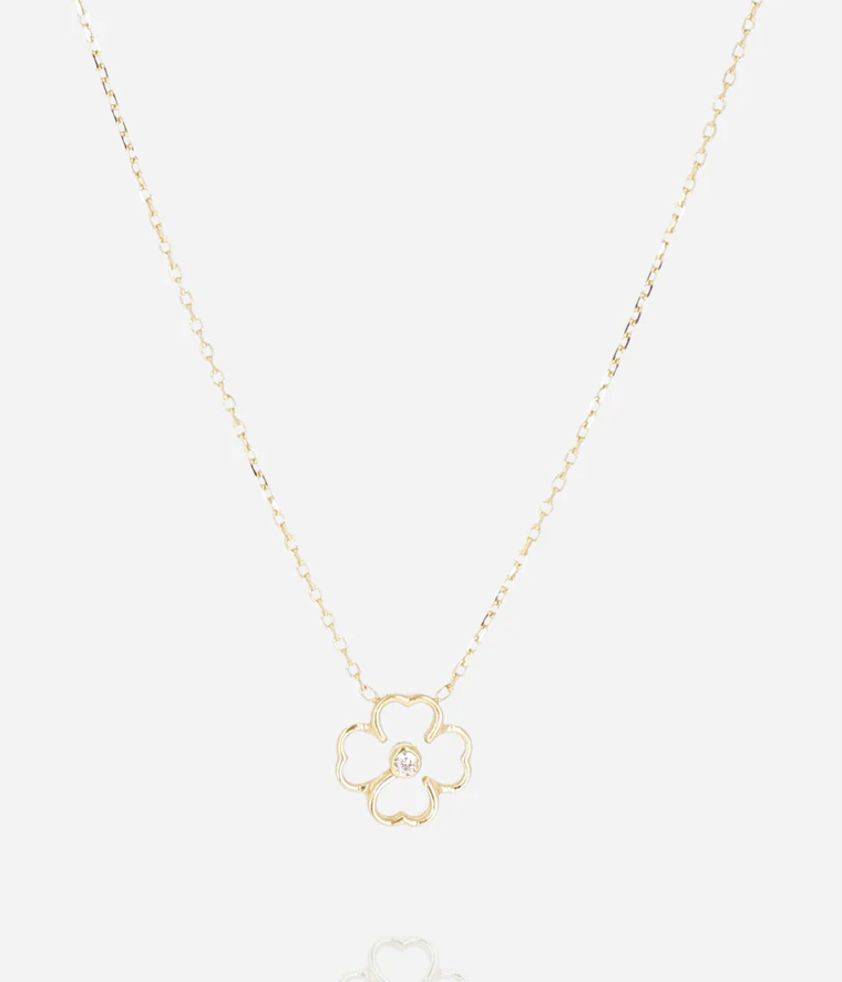 Collier en acier uni ou doré à l’or fin serti d’une fleur en acier au milieu de laquelle se trouve un zirconium.