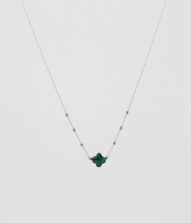 Collier chaîne « chapelet » en acier uni ou doré à l’or fin par ionisation sur lequel est attachée une pierre naturelle en forme de petit trèfle.