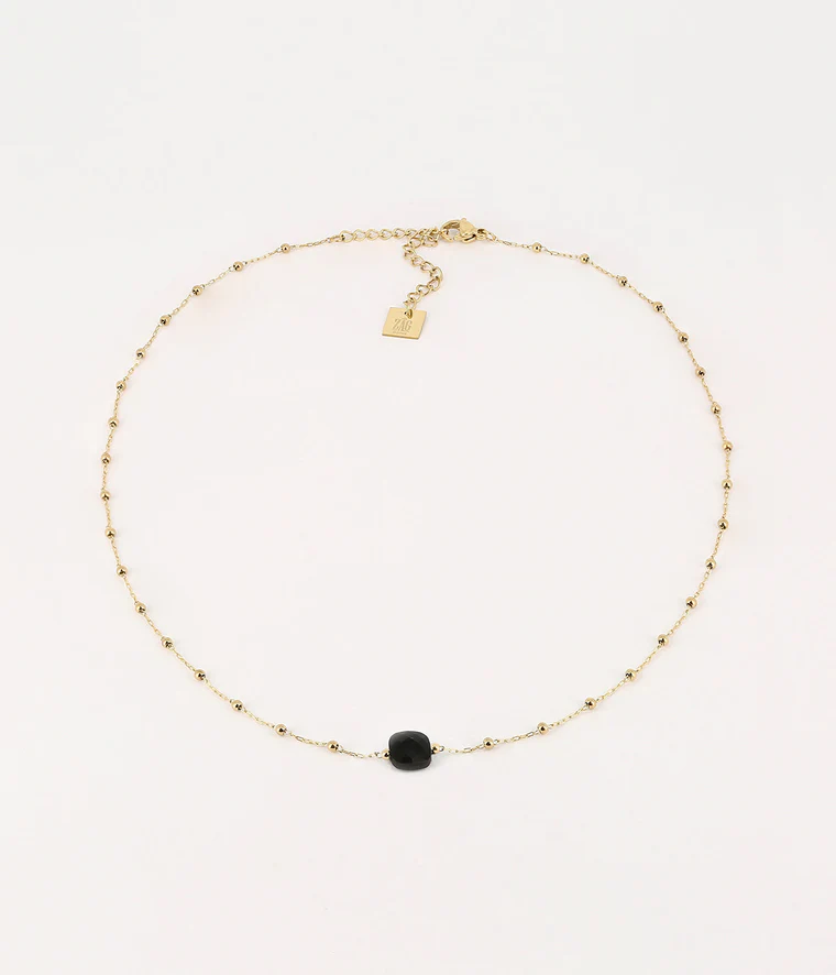 Collier chaîne “chapelet” en acier doré à l’or fin sur lequel est attachée une pierre naturelle.