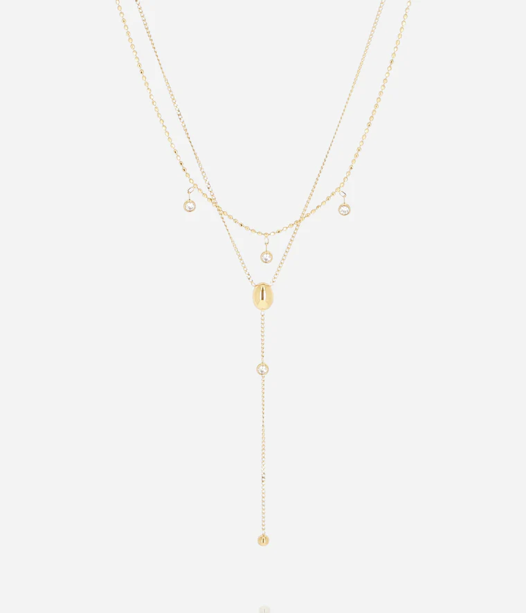 Collier en acier uni ou doré en double chaîne. L’une est sertie de petits zirconiums et l’autre est en Y avec un empiècement en acier au centre et un petit zirconium sur la chainette.
