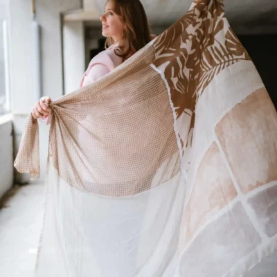 80,00€Le foulard Shanna est un assemblage de 4 morceaux de tissus différents, agrémenté de rubans décoratifs et assortis.
