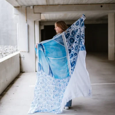 Le foulard Shanna est un assemblage de 4 morceaux de tissus différents, agrémenté de rubans décoratifs et assortis.