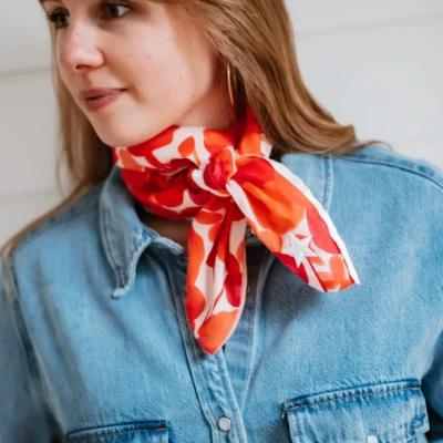 Le foulard Shanna est un assemblage de 4 morceaux de tissus différents, agrémenté de rubans décoratifs et assortis.