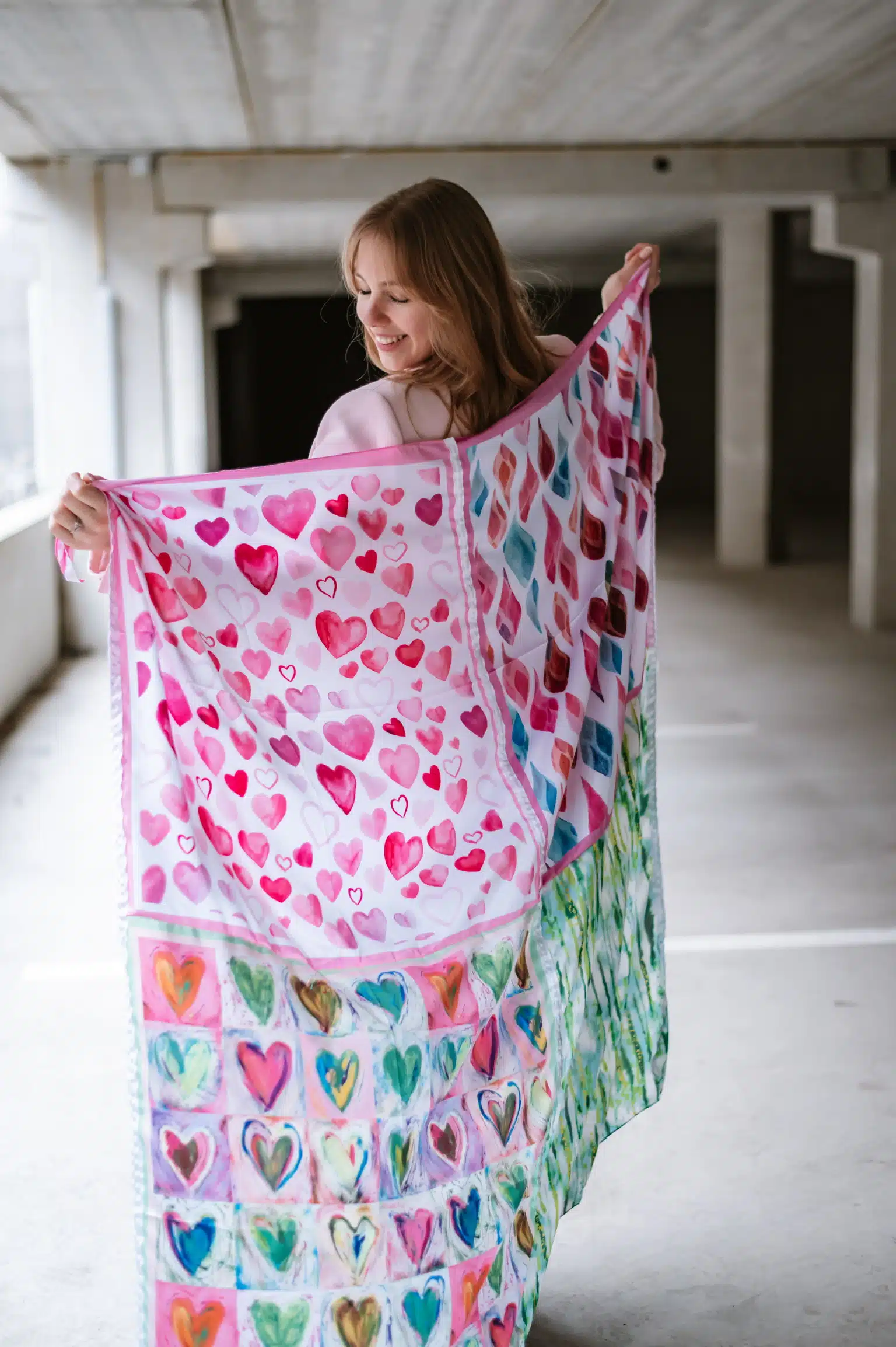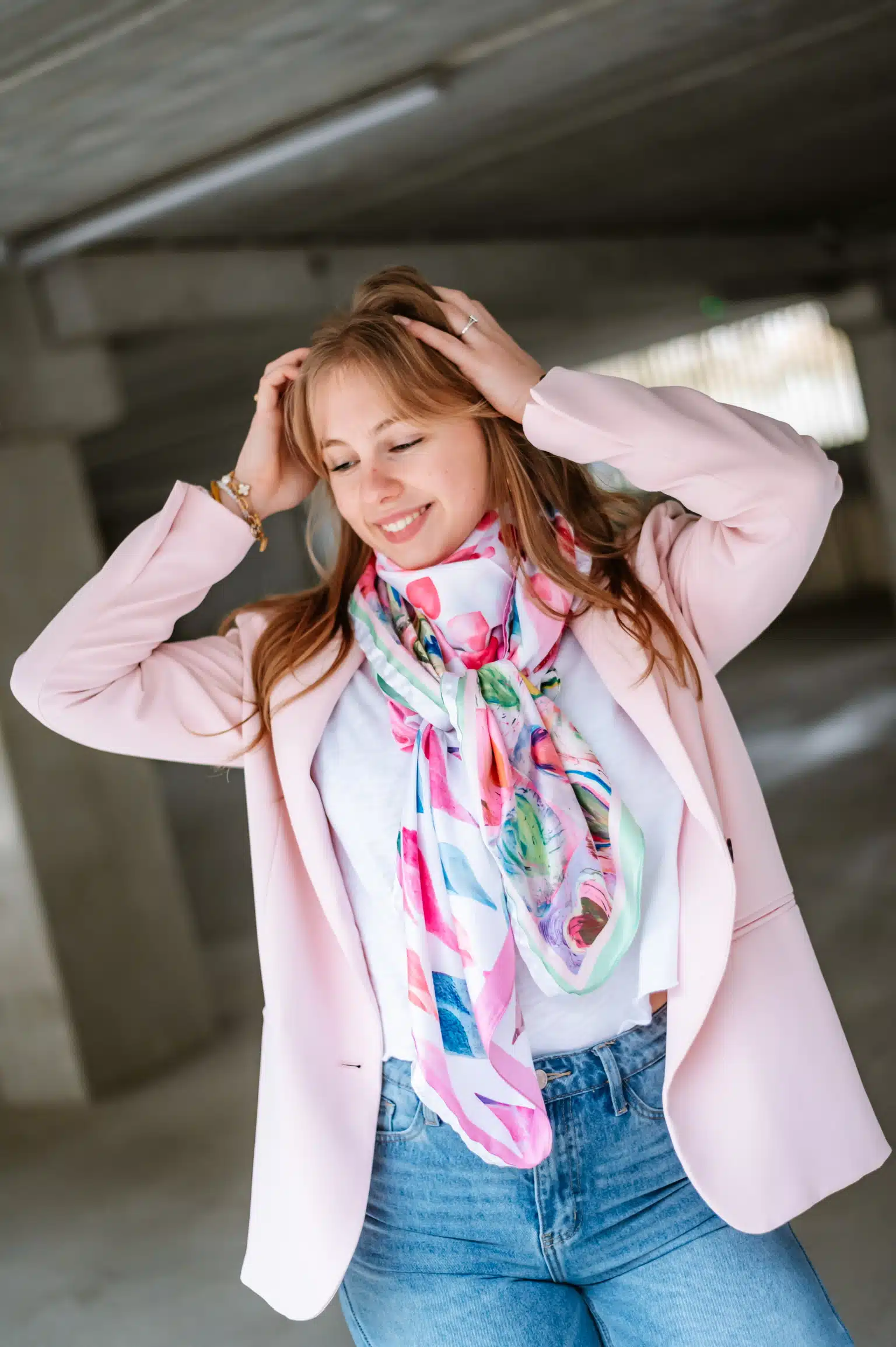 Le foulard “soie” Shanna est un assemblage de 4 morceaux de tissus différents, agrémenté de rubans décoratifs et assortis. Le carré soie Shanna Printemps/été 2026 est léger, et agréable à porter. Il vous accompagnera en début de saison pour apporter couleurs et luminosité à vos tenues et il vous tiendra chaud les soirées d’été.