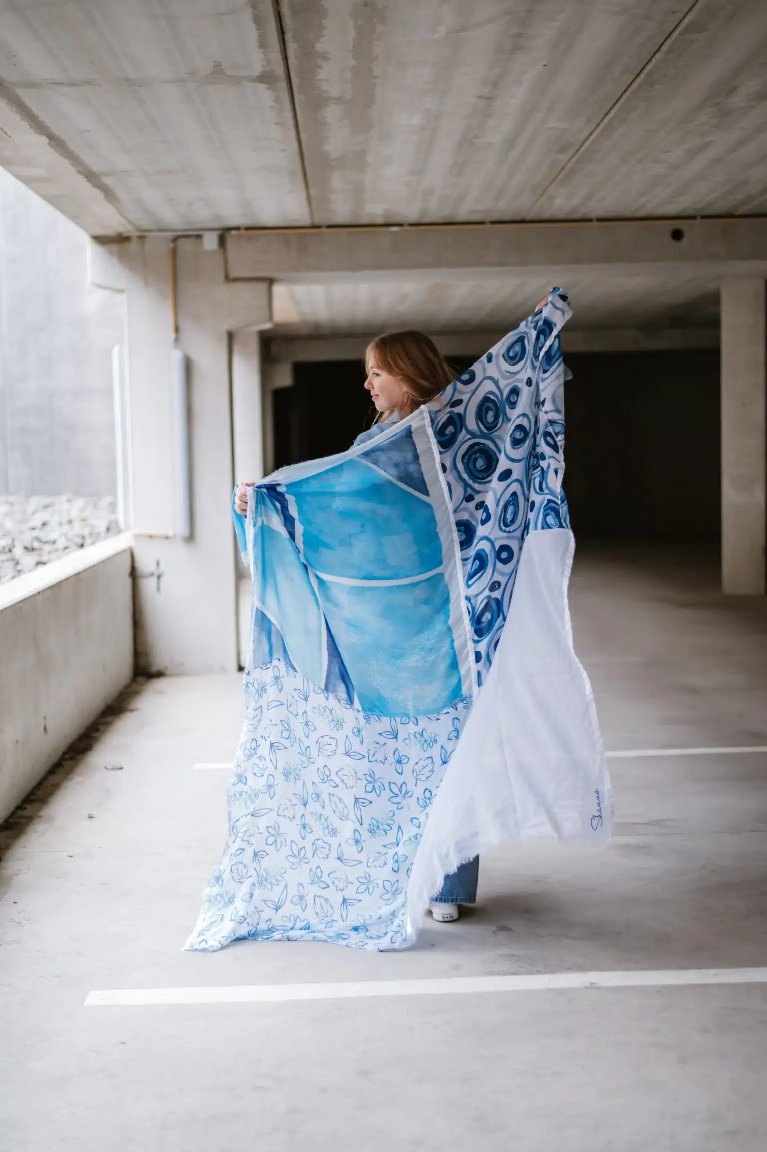 Le foulard Shanna est un assemblage de 4 morceaux de tissus différents, agrémenté de rubans décoratifs et assortis.