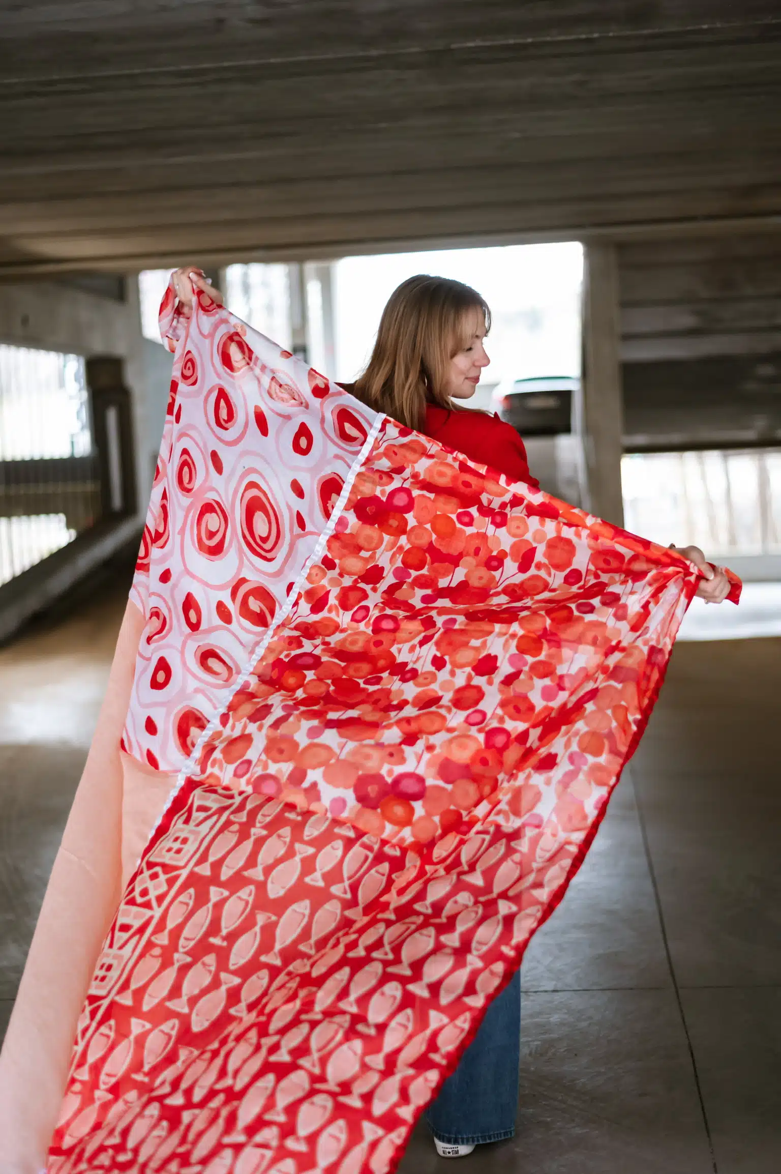 Le foulard Shanna est un assemblage de 4 morceaux de tissus différents, agrémenté de rubans décoratifs et assortis.
