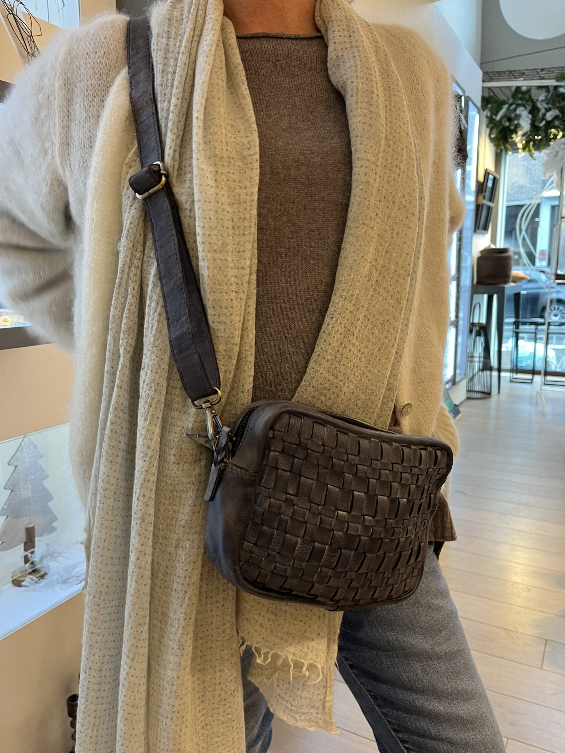 - Couleur : Jacquard caramel/noir avec dos en cuir